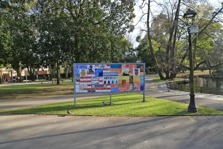 Mural «Centenario de las fiestas de El Bollo» en Avilés. Autor: Ramón Rodríguez (Avilés, 1943). Ubicación: plaza de Camposagrado (Avilés). Año de instalación: 1993. Datos: Serigrafía cerámica sobre gres in ...
